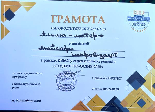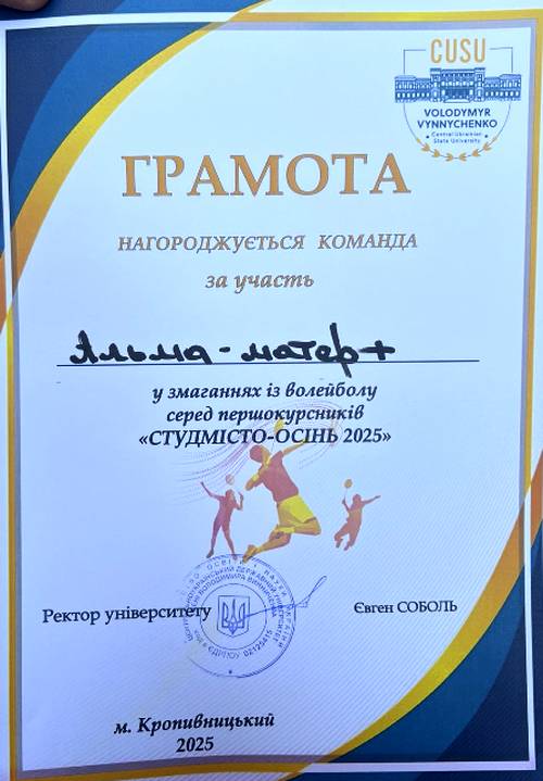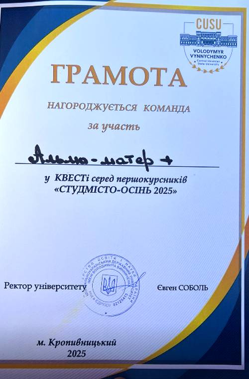Студенти коледжу «Альма-матер. Плюс» взяли активну участь у захопливому спортивному квесті «Студмісто – осінь 2025», організованому студентською радою Центральноукраїнського державного університету імені Володимира Винниченка. Цей захід став чудовою нагодою для наших хлопців та дівчат проявити свої спортивні таланти й продемонструвати командний дух.