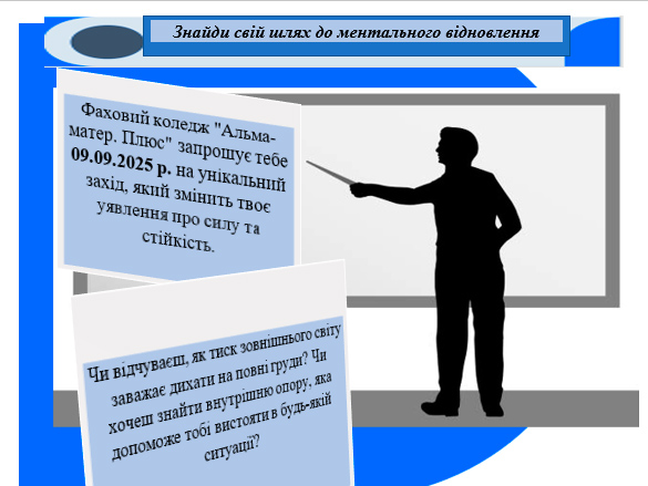 Фаховий коледж "Альма-матер. Плюс" запрошує студентів І курсу 09.09.2025 р. о 9:30 в ауд.52 на унікальний захід, який змінить твоє уявлення про силу та стійкість: